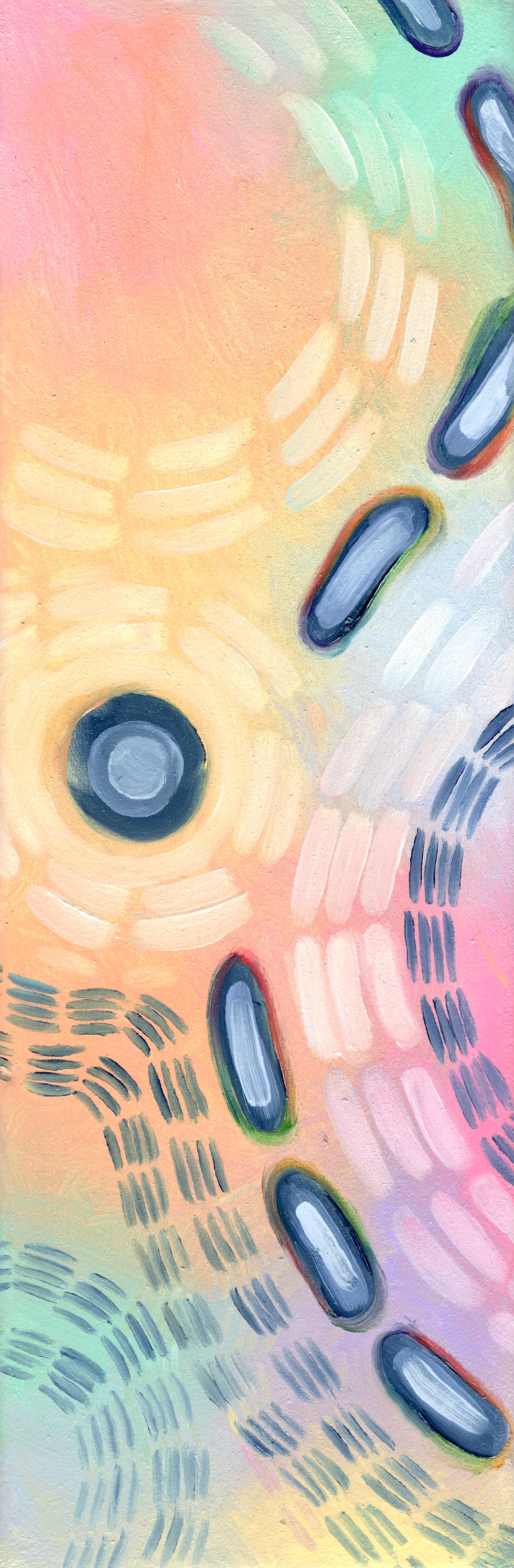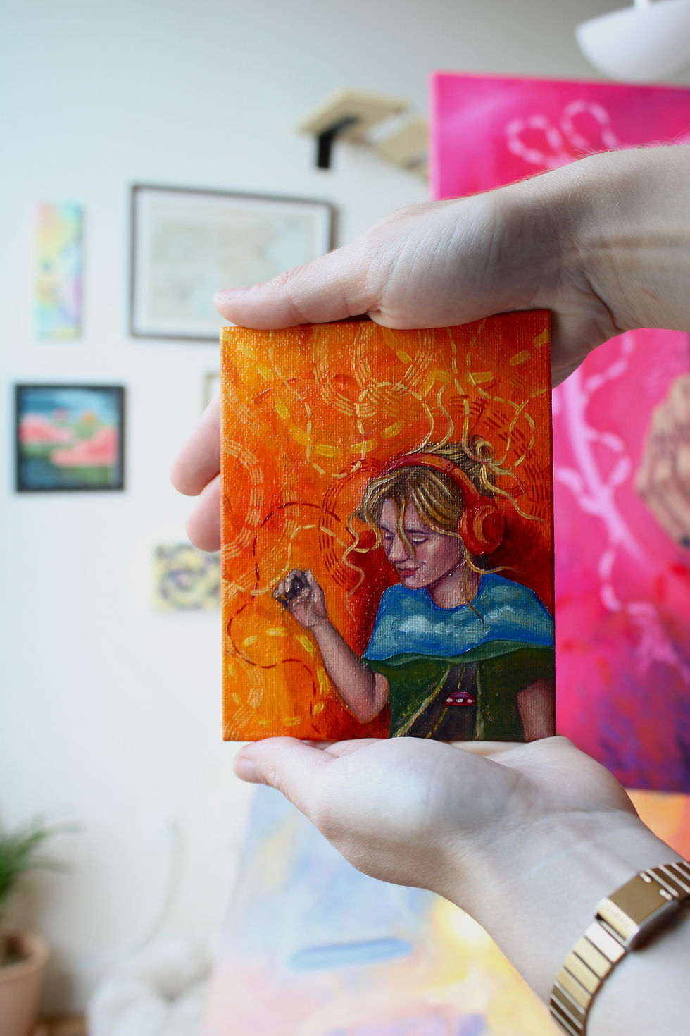 I created this painting for the love of sound and new experiences- for people who live life to a soundtrack curated by artists and visionaries sharing their humanity. This painting is a part of my Muses series which explores my connection to the artists that unknowingly join me daily in the studio. Mgk's passion and authenticity has been a steady companion along my journey of self discovery and continues to shape my own artistic perspective. In this painting I explore his multi-faceted creativity and share my own interpretation of his work through my own creative lens, breaking down symbolic moments in both his music and visual storytelling.